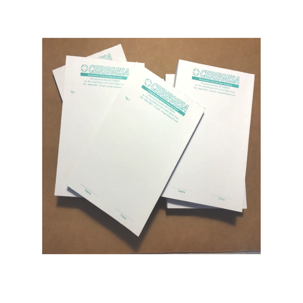 Contiene 100 hojas de 75 Gr. , portada y carton por debajo, impresos en negro y vienen encolados.